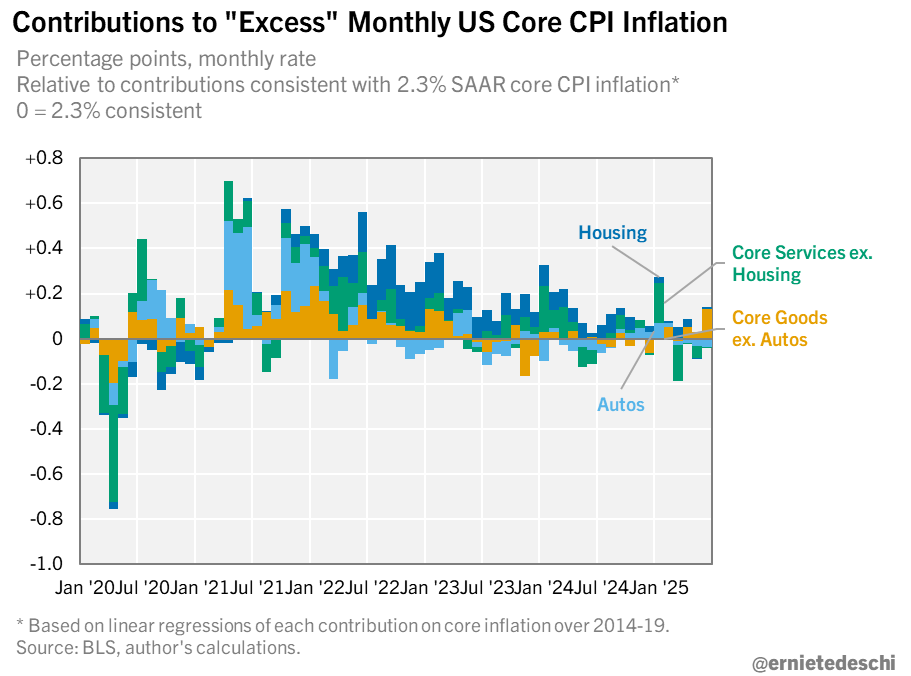 As of June, core goods ex-autos are contributing by far the most to "excess" monthly CPI -- or annualized inflation rates higher than the Fed's 2% target.