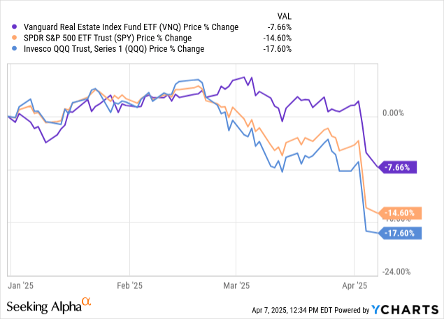 So far, in the current tariff-induced stock market crash, REITs (VNQ) have held up better than the rest of the market (SPY), especially Big Tech stocks (QQQ):