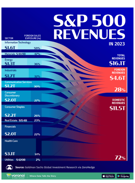 According to this illustration from Visual Capitalist, the US real estate sector derives 23% of total revenues from foreign markets. REITs like Prologis (PLD) and Simon Property Group (SPG) do own significant amounts of real estate in foreign markets.