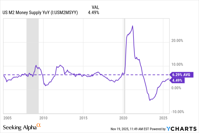 But notice that over the last several years, growth in the money supply has been well below average, even dipping into contraction in 2023-2024. It has now returned to modest growth, but that growth rate remains below its trailing 20-year average level.