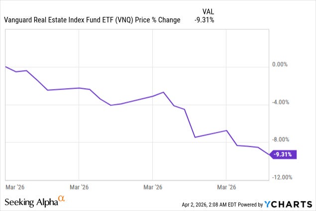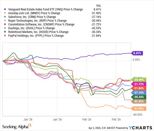 It started strong with REITs surging nearly 10% in value as the market became concerned about AI, and capital rotated from AI-disrupted businesses like SaaS companies towards AI-resilient businesses like REITs: