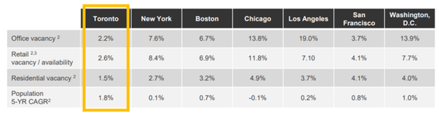 But when there is a lack of real estate relative to the expected growth, property owners are in a much stronger position. Compare Toronto's 2.6% retail vacancy rate relative to Chicago's 11.8%, or Toronto's 2.2% office vacancy relative to LA's 19%.