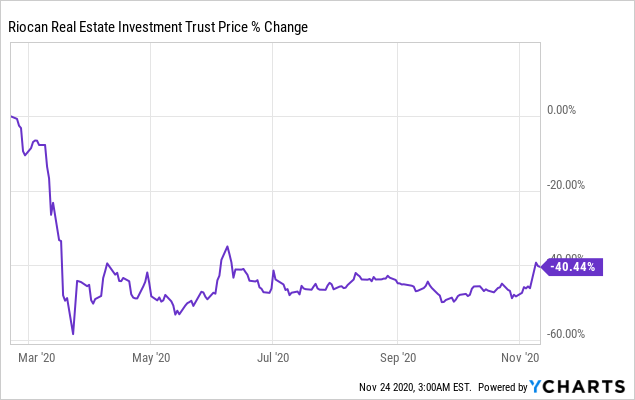 As noted in the introduction of this article, RioCan has dropped by ~40% in 2020: