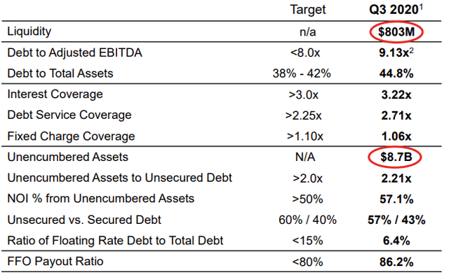 RioCan does not have the strongest balance sheet in the retail space, but not the worst one either. Its LTV is at 45% and it has ample liquidity bolstered by its large pool of unencumbered assets: