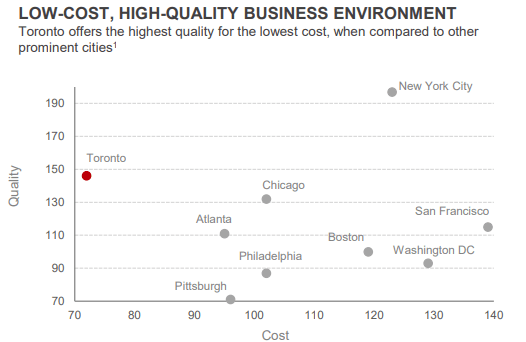 “Technology companies are hiring more workers in Toronto, attracted by the region’s diverse population of 6.4 million, a deep pool of skilled labor and cultural similarities to major U.S. cities such as San Francisco, New York and Chicago.” - Wall Street Journal