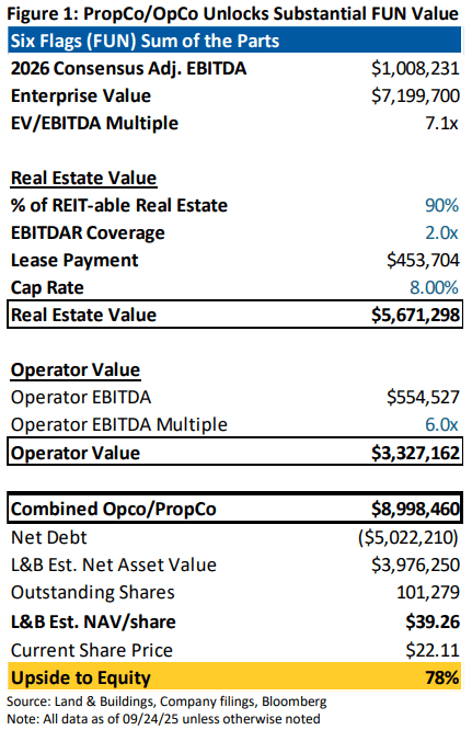 Today, with the Company’s valuation near all-time lows, we see an even more compelling re-rating opportunity from separating the real estate, with over 75% immediate upside based on 2026 consensus estimates (Figure 1). Upside could be as much as 130% if 2026 EBITDA recovers to $1.1 billion (FUN’s original 2025 guidance).