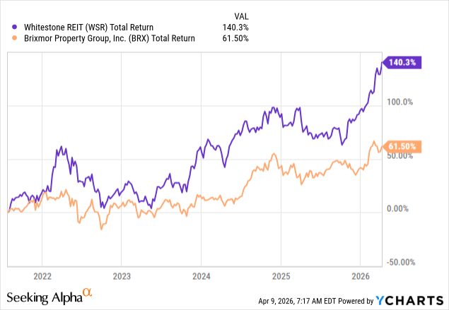 We first invested in the REIT in 2021, after selling its close peer, Brixmor Property Group (BRX), for an 87% return, and noting that WSR had become more opportunistic.