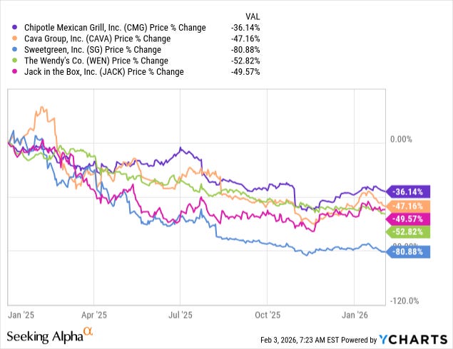 Restaurant companies like Chipotle (CMG), CAVA (CAVA), Sweet Green (SG), Wendy’s (WEN), and Jack in the Box (JACK) are down about 50% on average over the past year alone:
