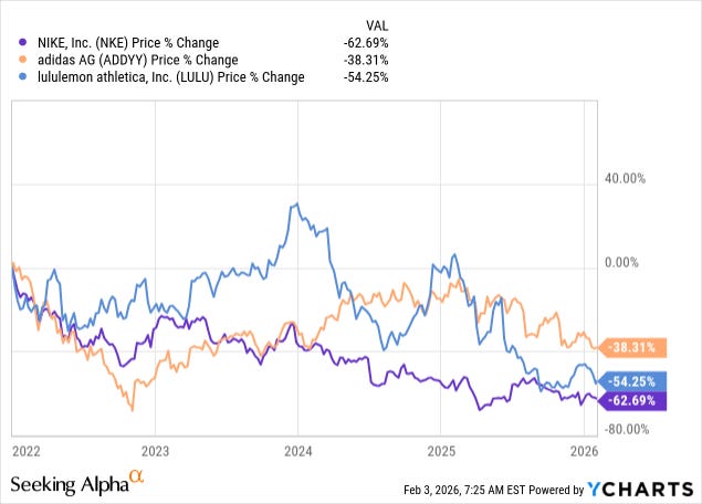 Apparel companies like Nike (NKE), Adidas (ADDYY), and Lululemon (LULU) have crashed just as much over the past few years: