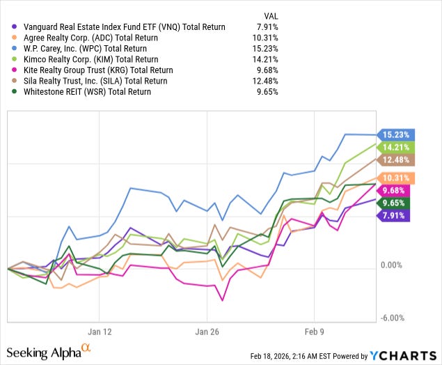 This has led to capital rotation from disrupted companies like SaaS, professional service providers, trucking companies, etc., into AI-proof asset classes like REITs.