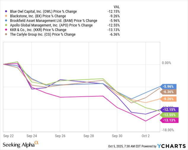 You will note from this chart that Blue Owl Capital (OWL) suffered one of the steepest sell-offs in its peer group, and we think that this is a great buying opportunity because OWL was already heavily discounted prior to this sell-off, and it should be the most recession-resilient in its peer group.