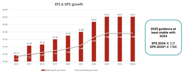 Finally, as a reminder, Xior's management is well-aligned with shareholders, owning about 10% of the equity, and they have an amazing track record of growth on a per-share basis. Despite the historic surge in interest expense, they have managed to maintain their FFO per share at €2.21, and growth could resume in 2026 as new development projects come online and rates are cut lower levels: