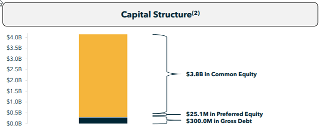It only has $300 million of debt, which represents a very low 11% LTV, and the company enjoys a 17x debt service ratio.