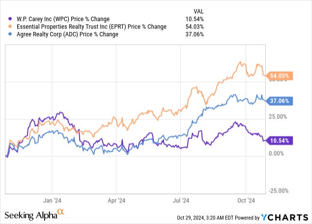 W.P. Carey is a net lease REIT just like Essential Properties Realty Trust (EPRT), Agree Realty (ADC), and others, but it has mostly missed out on the rally and as a result, it has now become far cheaper, relatively speaking:
