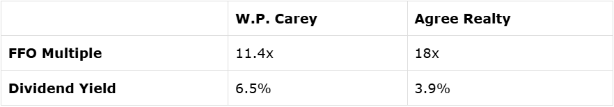 W.P. Carey's situation today reminds me a lot of Agree Realty (ADC) back in 2011. It was facing some tenant issues and it forced it to cut its dividend. This then depressed its market sentiment and it was one of the cheapest net lease REITs, despite owning strong assets for the most part.