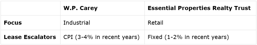 We don't think that this massive underperformance is due to fundamental reasons. On the contrary, we think that W.P. Carey is better positioned than ever, and a Trump presidency should favor it relative to its peers given that it owns mainly industrial properties that benefit from onshoring and it enjoys CPI-based rent escalations. In comparison, most its net lease peers own retail properties and are more exposed to the risks of tariffs and higher inflation.