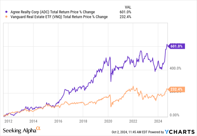 But it then rebuilt from a lower base and as it fixed issues and returned to growth, it became the single most rewarding net lease REIT in the following decade, easily outperforming its peers like Realty Income (O) and most other REITs: