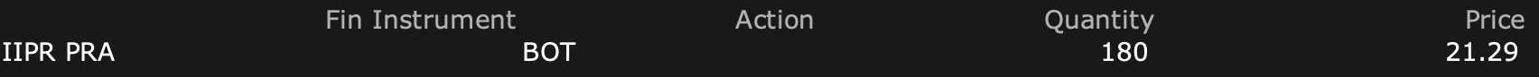 Transaction: We bought today another 180 shares of Series A preferred equity of Innovative Industrial Properties (IIPR), increasing our position size by 18%.