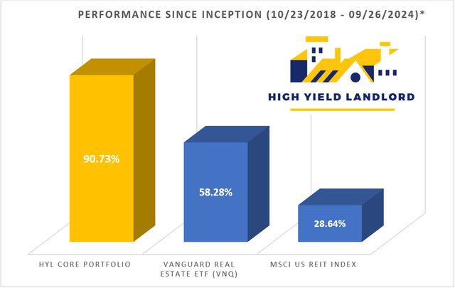 This approach has served me well. So well in fact that I eventually decided to end my career in private equity real estate to dedicate my full attention to REIT investing. In late 2018, I launched the Core Portfolio of High Yield Landlord and since then, it has generated a 90.73% return even despite the bear market that began in 2022. In comparison, our sector benchmarks earned a 28.64% - 58.28% return over the same ~6-year time period: