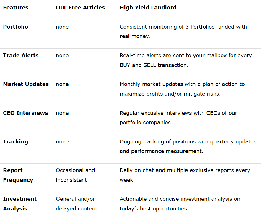The timely investment recommendations from High Yield Landlord have already paid for the annual membership in 3 months. Unlike other services, HYL also includes a chat system to discuss investment ideas with the multiple authors who run HYL and also other subscribers. Hearing multiple perspectives on investing in REITs helps identify companies to buy and those to avoid.