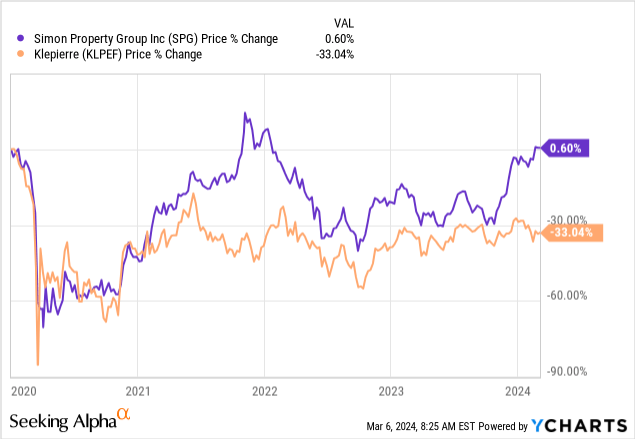 If not, it would not surprise me if SPG made a move to buyout KlePierre. As a reminder, SPG is its biggest shareholder, owning 20%+ of the equity, and it could probably expand its FFO per share by quite a bit given that it trades at a higher multiple and could benefit from many synergies.