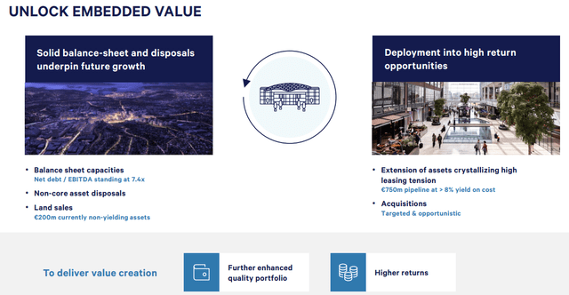But the good news in the case of KlePierre is that it has a strong BBB+ rated balance sheet, a 38% LTV, and a 6.3-year average debt maturity. Its Debt to EBITDA is a bit higher than its US peers at 7.4x, but it will come down in the coming years as the REIT sells some non-core assets, including some non-yielding land, and reinvests that into higher-yielding development/redevelopment projects: