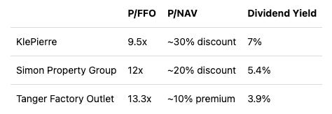 (I would add that KlePierre's discount to NAV may be understated because it has sold assets at 20% above its appraised values, and the current appraisal cap rate is about 6%, which is high for class A malls in Europe)