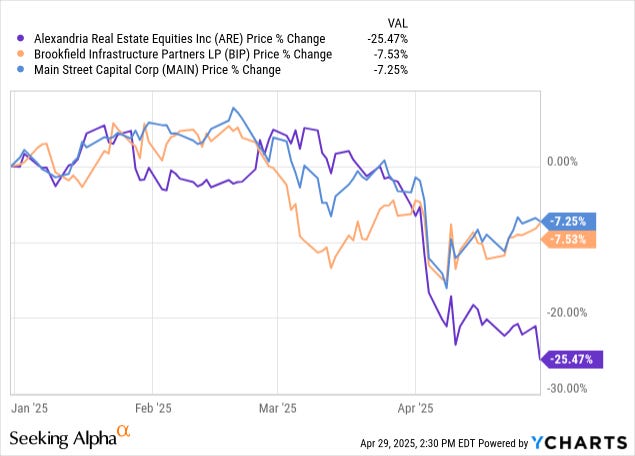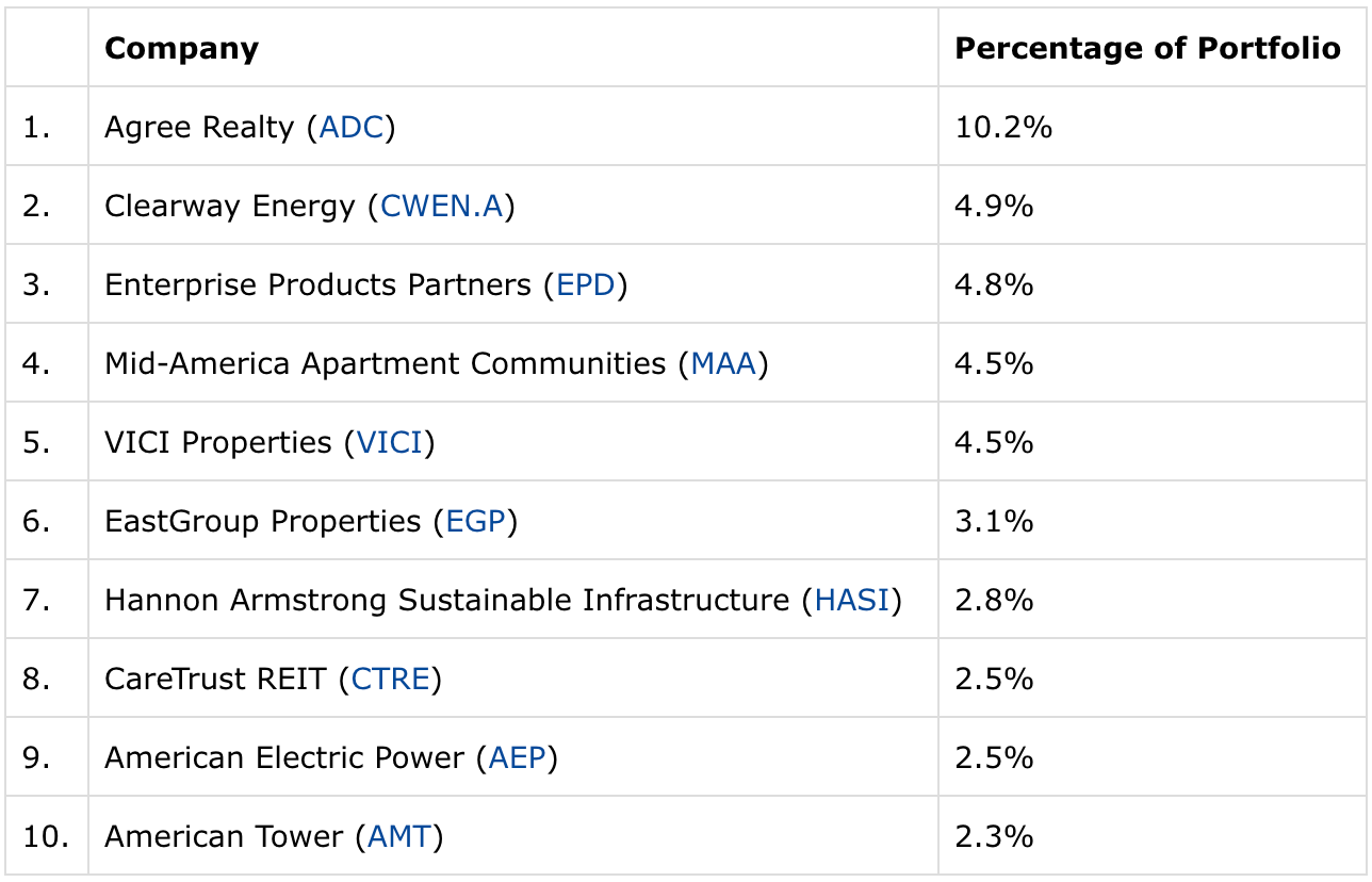 It's notable that in recent months, Alexandria Real Estate (ARE), Brookfield Infrastructure (BIP), and Main Street Capital (MAIN) have all slipped out of my top 10, not as a result of selling on my part but rather simply because their stock prices have dropped: