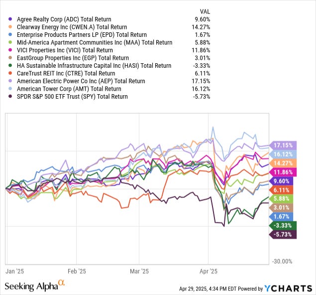 Regulated utility giant AEP, multi-national telecommunications REIT AMT, and and renewable energy owner/operator CWEN.A have led the pack in total returns so far this year.