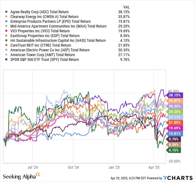 Only EastGroup Properties (EGP) and Hannon Armstrong Sustainable Infrastructure (HASI) have underperformed SPY over the last year, and not by that much.