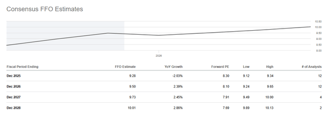 At a 7.8x FFO multiple, the market seems to be pricing ARE for negative growth, but the analyst consensus forecast calls for low-single-digit negative FFO per share this year followed by several years of low-single-digit growth.