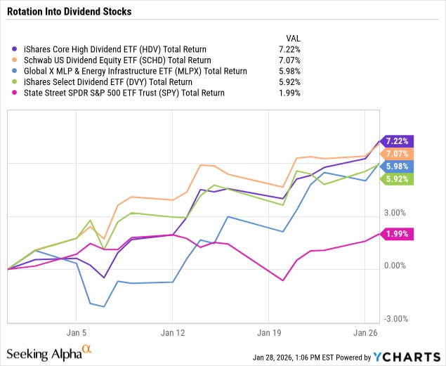 The large-cap dividend payers in the iShares Core High Dividend ETF (HDV) and Schwab US Dividend Equity ETF (SCHD) have already returned 7%+, while midstream energy companies (MLPX) have collectively returned about 6%, and the predominantly small/mid-cap portfolio of the iShares Select Dividend ETF (DVY) have returned just under 6%.