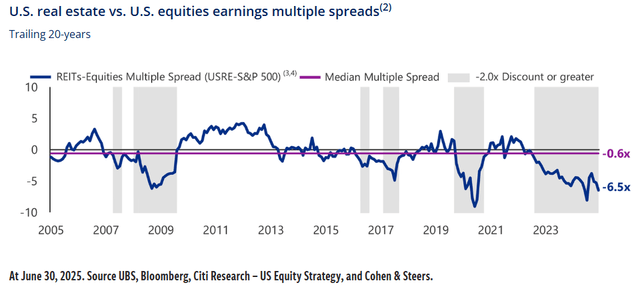 But at the same time, today, like the late 1990s, REITs are dramatically cheaper than the broader market: