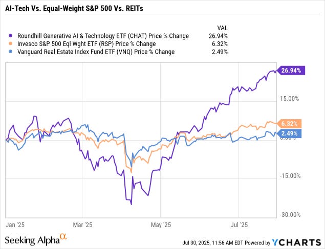 Compare, for example, the ~27% year-to-date gain of the Roundhill Generative AI & Technology ETF (CHAT) against a ~6% gain in the Equal Weight S&P 500 (RSP) and a ~2.5% gain from the real estate sector (VNQ):