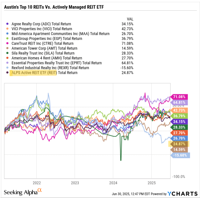 But within the real estate sector, I've done much better. For example, since the inception of the ALPS Actively Managed REIT ETF (REIT) four and a half years ago, my current 10 largest REIT holdings have outperformed the active manager.
