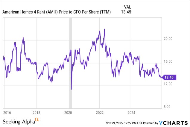 I’m also eyeing American Homes 4 Rent (AMH) as a holding to potentially add to right now, as its valuation is around its lowest level from the past decade.