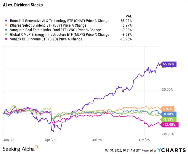 Just compare AI-related stocks (CHAT) to various types of dividend payers, from your standard high-dividend stocks (DVY) to real estate & REITs (VNQ) to midstream energy (MLPX) to business development companies (BIZD):