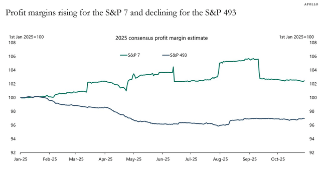 Anyway, it bears mentioning that most of the biggest players in the AI ecosystem have massive cash flows and high profit margins. In fact, for the biggest corporate giants in the S&P 500, those profit margins have only gone higher this year, while the profit margins for the rest of the index have declined: