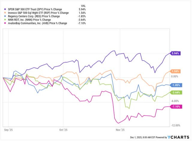 It may be that the gradual price increases for NNN REIT (NNN), Regency Centers (REG), and AvalonBay (AVB) reflected the expectation of further rate cuts by the Fed. Having dropped more than 5% in response to their earnings call, AVB made most of that back.